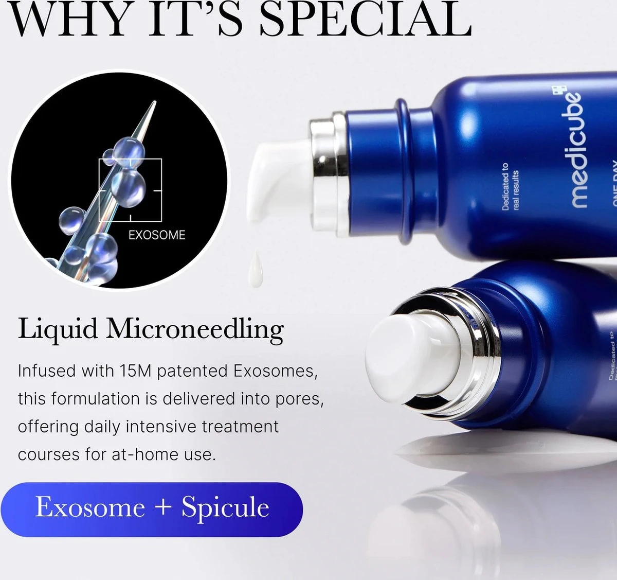 بستهبندی شیشهای ۲۰ میلیلیتری Medicube Exosome Ampoule با پمپ دقیق مصرف بهینه و نگهداری بهداشتی را تضمین کرده و کیفیت فرمول را حفظ مینماید.