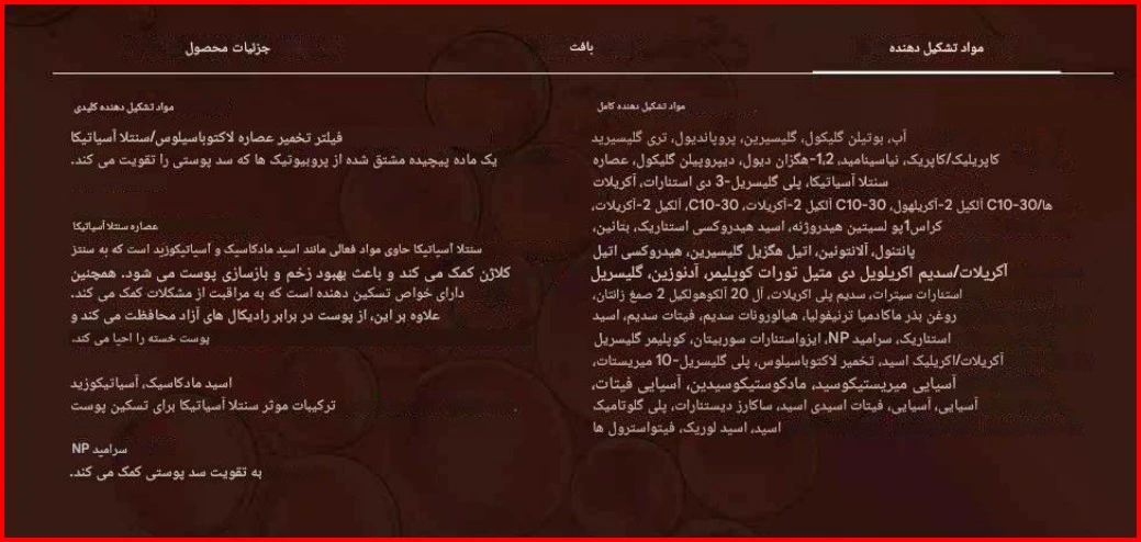 فرمول اختصاصی آمپول تسکین دهنده و تقویت کننده سنتلا با ترکیبی از پروبیوتیکها و عصاره سنتلا آسیاتیکا، فرایند ترمیم پوست را تسریع کرده و التهابات سطحی را کاهش میدهد.