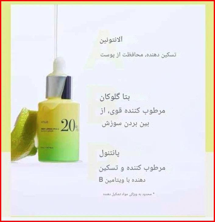سرم ضد لک ویتامین C لیمو سبز آنوا Anua Green Lemon Vita C Blemish Serum با فرمولاسیون منحصر بهفرد حاوی ۲۰٪ ویتامین C پایدار و ۵۶٪ عصاره طبیعی لیمو سبز، تیرگیهای پوست را هدف قرار داده و لکهای ناشی از آفتاب یا جای جوش را بهتدریج کاهش میدهد.