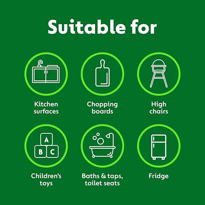 - عملکرد چندمنظوره؛ مناسب برای آشپزخانه، سرویس بهداشتی، کف، دستگیره در، مبلمان و تجهیزات کودکان