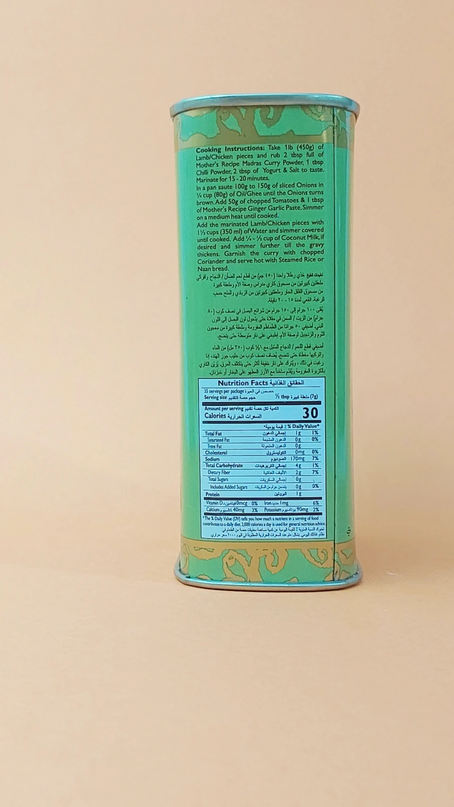 - ترکیب اصیل هندی شامل زردچوبه، گشنیز، زیره، فلفل قرمز، دارچین و شنبلیله